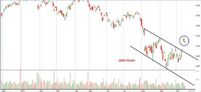 רוב השבוע התמהמנו באזור צפוף מאוד של 1130 -1147 כאשר 1147 משמש מחסום עליון ולא מתאפשרת פריצתו עד ליום הפקיעה. כפי שנראה בגרף מספר 1 (גרף יומי) המדד בסוף שבוע קודם פרץ תעלה יורדת כאשר ההתנגדות נמצאת ב 1182 יחד עם זאת בגרף מספר 2 (גרף שבועי) ניתן לראות שהמדד עדיין בתוך תעלה שעדיין לא נפרצה (נקודת הפריצה נמצאת באזור 1210).