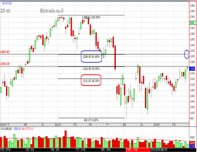 נמצא מתחת לנקודת 50% פיבונאצ'י של מהלך הירידות המשמעותי 1165. פריצה שלה והיעד 1206 נקודת 61.8% של אותו מהלך יורד עם נקודת עצירה ב 1182 שתהווה פעם התנגדות ופעם תמיכה עד שיוחלט על הכיוון. מנגד אי פריצת 1165 תוביל לירידה עד 1120 כאשר שבירתה (מוקף באדום) תוביל ליעד הבא ב 1100 ואחריו 1080 .