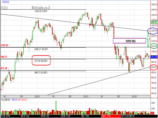מספר שבועות נתמכים על נקודת ה 980 ומנגד ניסיונות קודמים לפרוץ 1100 לא צלחו. בפעם הבאה שיפגשו את 1100 משם יתפתח המהלך כאשר יש גאפ פתוח ברמת 1180 והיעד המלא ללונג 1250 מנגד אי פריצת 1100 תניב את הירידה עד 900 בשלב הראשון.