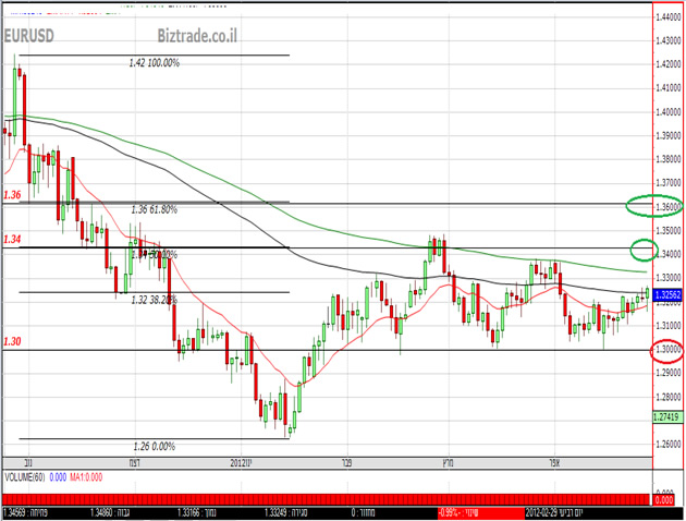 נקודת תמיכה קריטית 1.3 כל עוד הצמד נסחר מעל נקודה זו נמתין בסבלנות לפריצת הממוצע הירוק ב 1.332 לערך והיעדים הם 1.345 ואחריה 1.362. מנגד ירידה מ 1.3 יעד תחתון ממתין ב 1.26