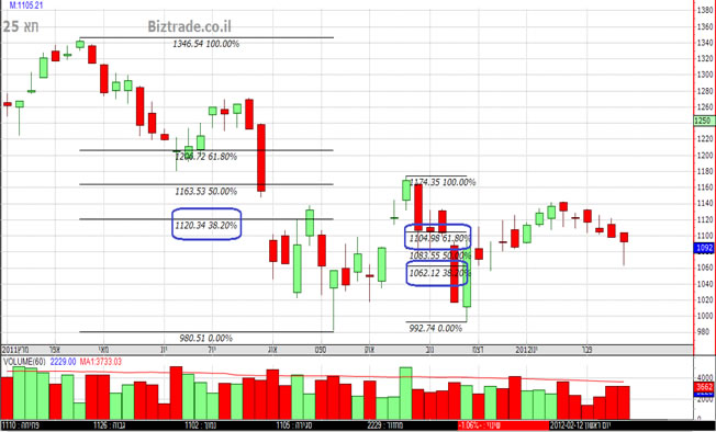 השבוע ת"א 25 ירד לבדוק תיקון שליש של הפיבונאצ'י (1062) וכעת הוא נמצא בין תיקון שליש אחד לתיקון שליש אחר (1120). הראשון שישבר\ייפרץ יוביל אותנו לתיקון חצי פיבונאצ'י