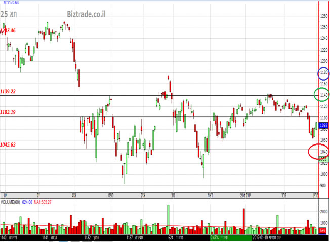 חוזר לבדוק את נק' ההתנגדות ב 1100 וממנה יצא המהלך הבא. 1140 או 1040 התנהגות המדד בנקודת ה 1100 תכריע.