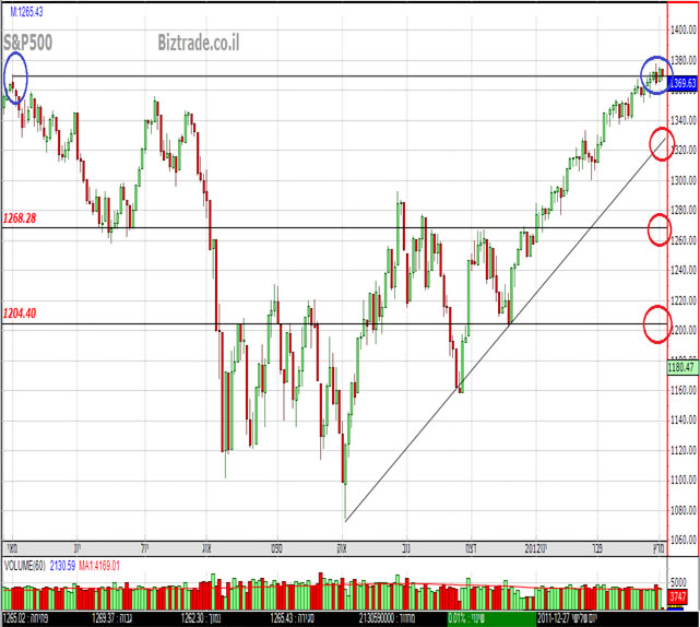 מתמודד עם אזור 1370 נק' שכבר בעבר היוותה מכשול שהניב מהלך יורד של למעלה מ 100 נק'. פריצתה והיעד הבא ממתין ב 1420 ומנגד ירידה ראשונה לקו תמיכה אלכסוני ובהמשך עד 1270.
