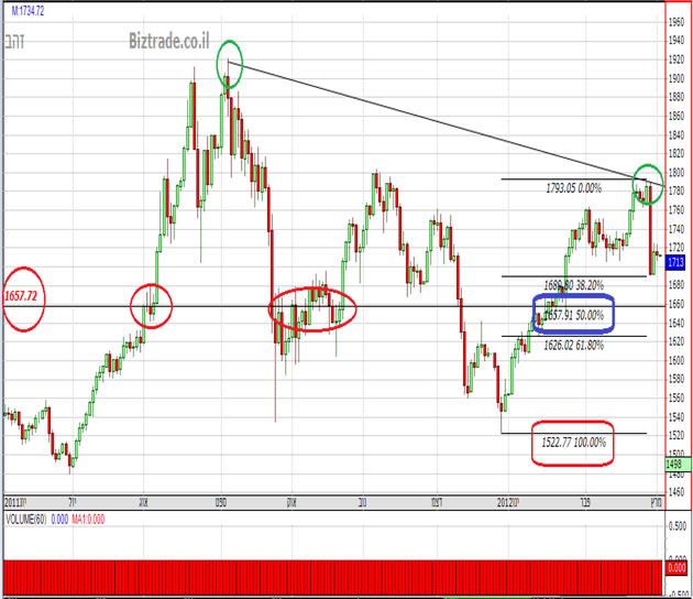 הגיע ל1880 ומשם חזר לתיקון שליש בפיבונאצ'י. פריצת קו ההתנגדות האלכסוני ויעד הזהב 1920 ואחריו מעל 2000 ואילו ירידה תוביל לתיקון חצי פיבונאצ'י שהיא גם קו התנגדות ב 1657.