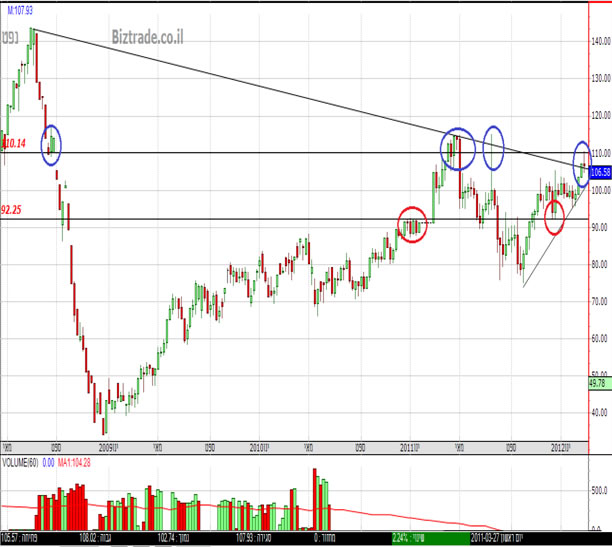 כל העולם עוקב בדריכות אחרי כיוון הנפט. נמצא בנק' מעניינת מצד אחד מתחת לתנוקדת התנגדות ב 110 ומנגד מעל קו התנגדות אלכסוני ב 106. צפוף מאוד וכל משפט או אירוע משני יכול להקפיץ את מחירו ל 120 ועד 143 או להפיל את מחיר הנפט עד ל 92.