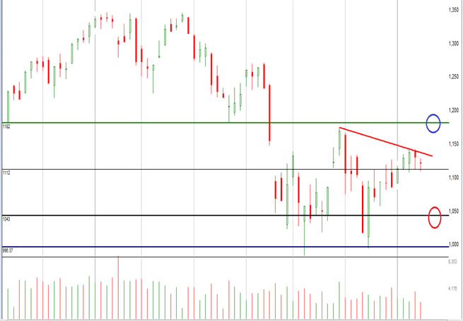 המדד מתחת לקו התנגדות אדום. פריצתו תוביל עד ליעד 1182 (קו ירוק) ואיךו ירידה מ1100 תוביל ליעד ב 1045 (קו שחור).