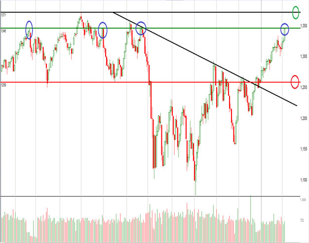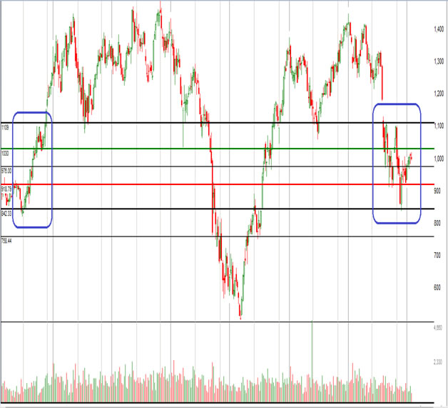 הרבה לא השתנה משבוע שעבר ואנחנו עדיין בתוך טווח דשדוש מצומצם ונק' הפריצה והשבירה לא השתנו. על מנת שיצא מטווח הדשדוש הזה צריך קצת יותר פעילות ומחזורים. נכון שחושבים שכדי לרדת לא צריך מחזור אבל זה לא מדויק ובוודאי שאי אפשר לטפס לא כל שכן לפרוץ נקודות התנגדות ללא מחזור ולכן כאן המפתח. הכסף "החכם" ימתין על הגדר עד שיאתר נקודת חבירה נוחה למהלך הלונג וכל עוד לא ישתכנע שבשלב הזה כאן הנקודה הכי נמוכה לא יצטרף ואילו הכסף ה"טיפש" ימתין להיות בטוח שעכשיו עולים וכמו ברוב הפעמים יצטרף בקצה גל העליות. כרגע כל עוד אנחנו מעל 1085 ובוודאי מעל 1100 הכיוון הוא לונג. ירידה מ 1080 תהיה הסמן הראשון לשורט וירידה מ 1050 תאשר אותו סופית. מצד שני פריצת 1138 (בערך) תהיה האות למהלך ל 1180 ובהמשך ל1200-20.