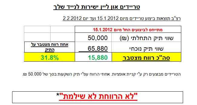 מצטרפים לשירות בחודש פברואר 2012 נהנים מטריידים מפורטים ומתוזמנים ומשלמים רק אם התשואה חיובית בסוף החודש.