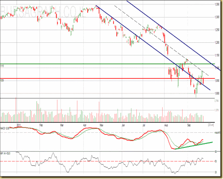 גרף זה הינו גרף חשוב, בגרף זה אני רואה תעלה יורדת, כאשר הגבול העיון נימצא ברמת 1115. מתנד ה MACD מראה לי על תיקון צפוי למגמת הירידה שאנו נמצאים בה עכשיו.