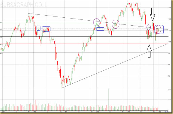 במידה ורמה זו (1115) לא תיפרץ אנו צפויים לדעתי לבקר ברמה 1048, רמה זו הינה חשובה וניתן לראות את הנקודות בהם רמה זו שימשה כרמת תמיכה\התנגדות (המלבנים הכחולים), אם רמה זו תישבר סביר להניח שנלך לכיוון 983.