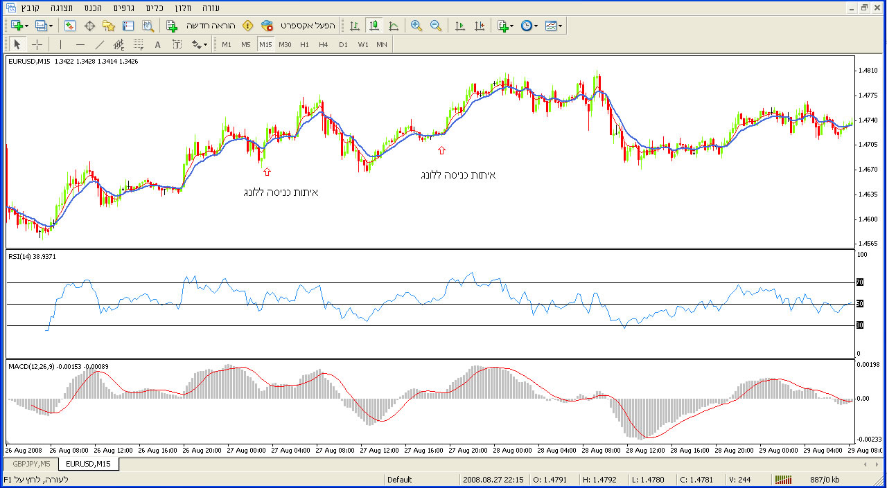 איתותי כניסה: כאשר בגרף 4H הממוצע EMA=5 חוצה את EMA=10 מלמטה למעלה וה- RSI גדול מ- 50 אך נמוך מ-70 - עוברים לגרף 15M ומחכים לאותם תנאים לצורך קבלת אישור סופי לכניסה.
