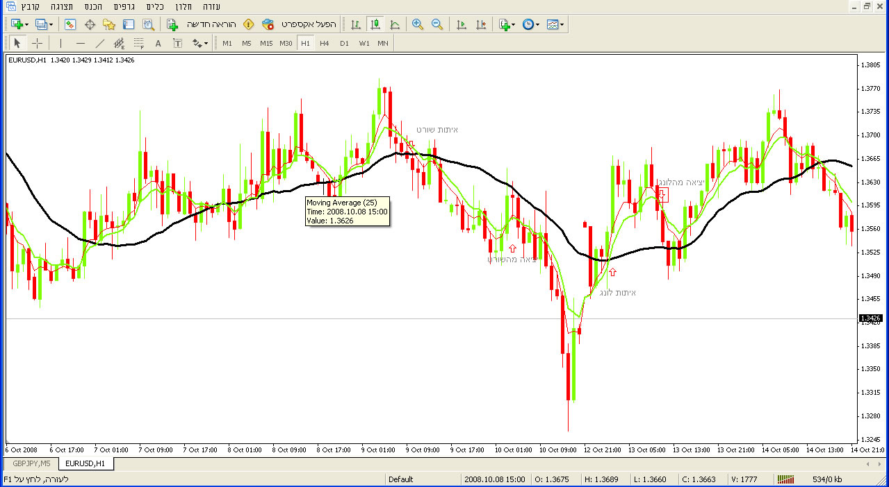 היציאה מאותה עסקה כאשר הממוצע הקצר MAE=5 חותך את הממוצע הבינוני MAE=8 מלמטה למעלה.