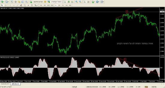 בתוכנת "מטה טריידר 4"- מוצג נתון ה-MACD כ-עקומה וה-SIGNAL מוצג כהיסטוגרמה.