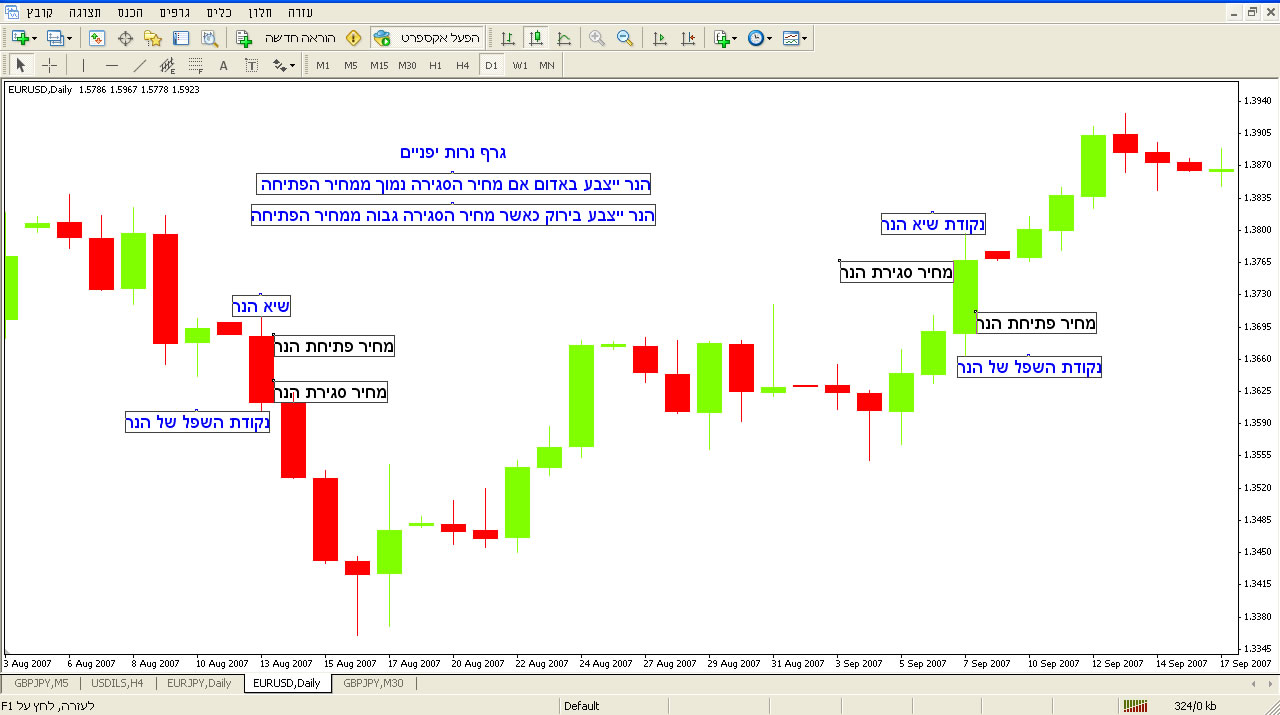 גרף CANDLESTICK – גרף "נרות יפניים" הינו גרף זהה לגרף OLHC BAR מבחינת הנתונים אותם הוא מספק לנו אך שונה באופן הצגתו. את מחירי הפתיחה והסגירה לא נדע לזהות ללא צבעי הנר. בד"כ נר יפני המסמל עליה (כלומר נר שבו מחיר הסגירה גבוה ממחיר הפתיחה) ייצבע בצבע ירוק ואילו נר יפני המסמל ירידה (כלומר נר שבו מחיר הסגירה נמוך ממחיר הפתיחה) ייצבע בצבע אדום. אולם אין בצבעים אלו אחידות מוחלטת וישנם המציגים את הנרות גם בצבעים אחרים. רוצה ללמוד עוד על נרות יפניים? הקלק כאן רוצה ללמוד עוד על תבניות