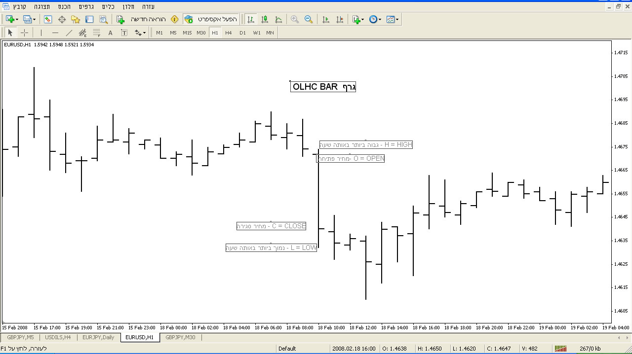 גרף OLHC BAR - גרף "בארים" אשר מציין עבורנו 4 נתונים O = OPEN מחיר הפתיחה, L = LOW המחיר הנמוך ביותר לטווח הזמן אותו הוא מציג, H = HIGH המחיר הגבוה ביותר לטווח הזמן אותו הוא מציג, C = CLOSE מחיר הסגירה. מחיר הפתיחה יוצג ע"י קו קטן הבולט מהבאר שמאלה. ומחיר הסגירה יוצג ע"י קו הבולט מהבאר ימינה.
