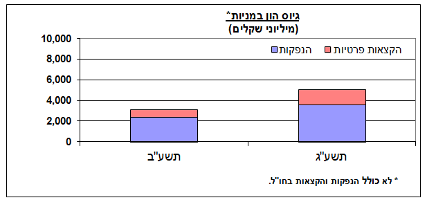 היקף גיוס הכספים ע"י הסקטור העסקי באמצעות הנפקות והקצאות של איגרות חוב הסתכם בכ-32.5 מיליארד שקל בתשע"ג, בדומה לשנה הקודמת (הסכום בתשע"ב אינו כולל הנפקה והקצאה של איגרות חוב "חשמל" מגובות בערבות מדינה, בשווי 6 מיליארד שקל ובתשע"ג אינו כולל הקצאה פרטית של אג"ח אלה בסך כ-1 מיליארד שקל ).