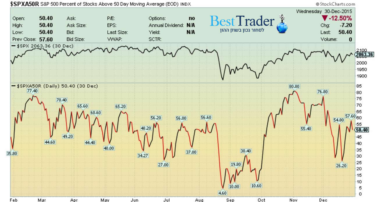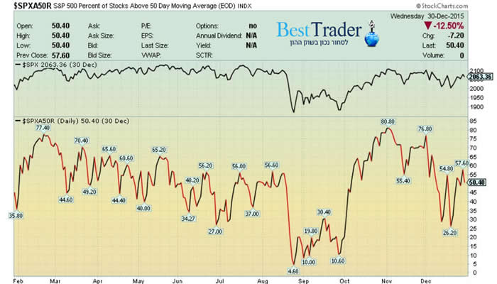 חיזוק ברור לכך ניתן לקבל כשמנתחים את הגרף הבא המלמד כי אחוז המניות במדד ה-500SP הנסחרות מעל ממוצע נע 50 צנח מתחילת חודש נובמבר ועד היום בעשרות אחוזים.