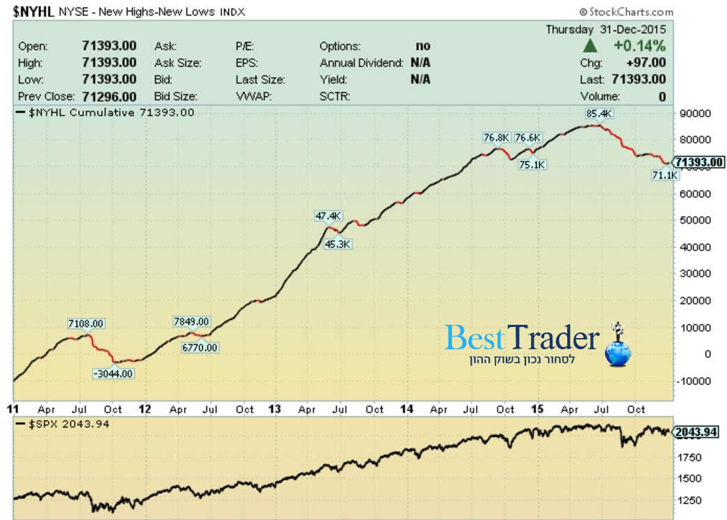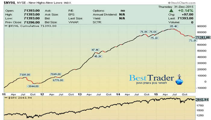 אישור נוסף לחולשה מתחת לפני השטח ניתן לקבל גם מהגרף הבא המציג את היחס שבין כמות המניות שנסחרות בשיאים חדשים מול כמות המניות שנמצאות בשפלים חדשים - בבורסת NYSE. כאמור, ע"פ הגרף המוצג הקריאה המוצגת מצביעה על ירידה חדה וכשזה קורה תוך דישדוש מובהק במדד המניות המרכזי של ארה"ב ככל הנראה יש מי שמוכר לנו מניות באופן אגרסיבי ועמל על כך שלא נראה זאת כדי שחלילה לא נבהל ונמכור.