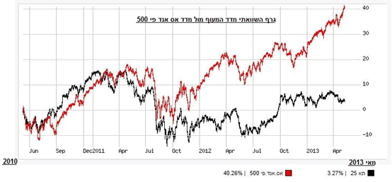 מדד ת"א 25 סיים עוד שבוע מסחר ללא בשורה משמעותית. הדשדוש הארוך שהחל אי שם באוקטובר 2012 (כן, כבר חלפו להם כשבעה חודשי שיעמום שבהם מדד המעוף "רץ לרוחב") נמשך ולא מתחשב בכל מיני הערכות שנזרקות לאוויר כבר שבועות רבים מצד אנליסטים וטכנאים מקומיים. נראה שהסוחרים המקומיים לא ממהרים לקנות את הסחורה ולא נסחפים אחרי תקוות שהמדד ידביק את הפערים הגדולים שנפתחו מול הבורסות מעבר לים. לפני מספר שבועות עמדנו על הפערים של מדד המעוף מול השוק האמריקאי וזה הזמן להמשיך לבחון את תמונת המצב. כשאני עושה השוואה של מדד מרכזי בישראל למדד מרכזי אמריקאי אני אוהב להביט על מדד ה- אס. אנד. פי. 500 משום שזהו המייצג המשמעותי ביותר לשוק המניות האמריקאי לטעמי. הגרף הבא מתאר מה עשו המדדים מאמצע שנת 2010 ועד היום (3 שנים תמימות):