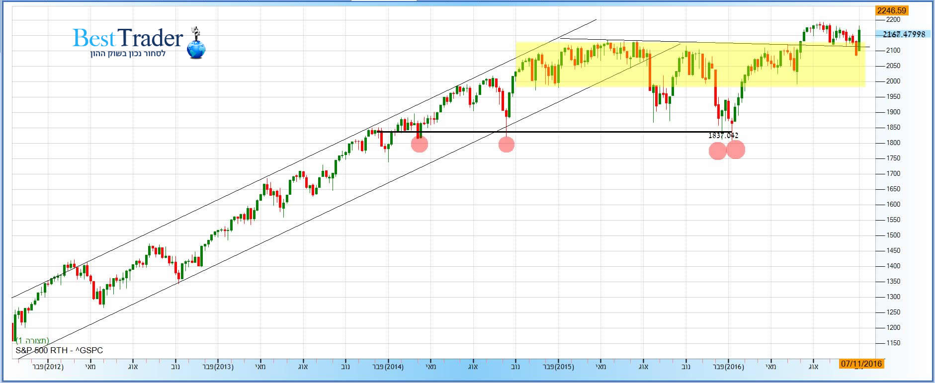 הבשורות הרעות בקשר למדד ה-S&P500 הן שהוא נעצר ומדשדש מאז חודש יולי. הבשורות הטובות הן שהוא נעצר במקום הנכון, מעל קו התמיכה שבו ציפינו לפגוש בביקושים ערים ובימים האחרונים זינק. הזינוק הזה לא מובן מאליו משום שהוא מגיע כנגד ציפיות הפרשנים שניבאו כי אם טראמפ יבחר השוק יקרוס אך כאמור בניגוד לציפיות הקונים הגיעו, תמכו בשוק וראינו זינוק חד מעלה. כפי שציינו כאן, החודשיים הקרובים יביאו עימם לא מעט תנודתיות הן בגלל תוצאות הבחירות המפתיעות בארה"ב והתזוזות הנלוות לכך והן בגלל הציפיות להעלאת ריבית עוד השנה בארה"ב. מבחינה טכנית עד לניפוץ שיא חדש במדד ה-500SP מעבר ל-2190 נק' לא באמת ניתן לקבוע חד משמעית את הכיוון משום שעל אף התנודתיות השוק יכול לדשדש עוד זמן רב.