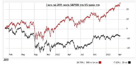 מדד ת"א 25 סיים עוד שבוע מסחר ללא בשורה משמעותית. הדשדוש הארוך שהחל אי שם באוקטובר 2012 (כן, כבר חלפה חצי שנה שהמדד "רץ לרוחב") נמשך ולא מתחשב בכל מיני הערכות שנזרקות לאוויר כבר שבועות רבים מצד אנליסטים וטכנאים מקומיים. נראה שהסוחרים המקומיים לא ממהרים לקנות את הסחורה ולא נסחפים אחרי תקוות שהמדד ידביק את הפערים הגדולים שנפתחו מול הבורסות מעבר לים. בואו נתעכב לשניה על הפערים העצומים שנפתחו מול המדדים המובילים בארה"ב. לשם השוואה נקח את מדד S&P 500 שנחשב לגדול והמשמעותי ביותר. הגרף הבא מתאר מה עשו המדדים מתחילת שנת 2011 ועד היום: