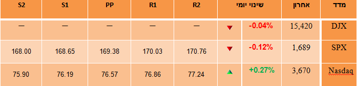 מדד הדאו ג'ונס וה-S&P 500 סיימו בירידות את יום שני, בעודם מרחיבים את שבוע הירידות החזק ביותר מאז יוני בשבוע שעבר. מניית אפל (AAPL) ובלאקברי (BBRY) הצליחו לשמור את מדד הנאסדק מעל לפני המים. מחזורי המסחר היו צרים וסימנו את אחד מחמשת ימי המסחר הדלילים ביותר של השנה עם פחות מ-5 מיליארד מניות שהחליפו ידיים. סוחרים רבים פורשים לחופשה במהלך אוגוסט. העדרם מגביר את תנודתיות השוק. עונת הרווחים מתקרבת לסיומה ומכניסה את השוק לתקופה איטית במחזוריות השנה. מדד ה-S&P 500 סיים את יום המסחר בירידה קלה של 0.12% בעוד מדד הנאסדק טיפס ב-0.27%.