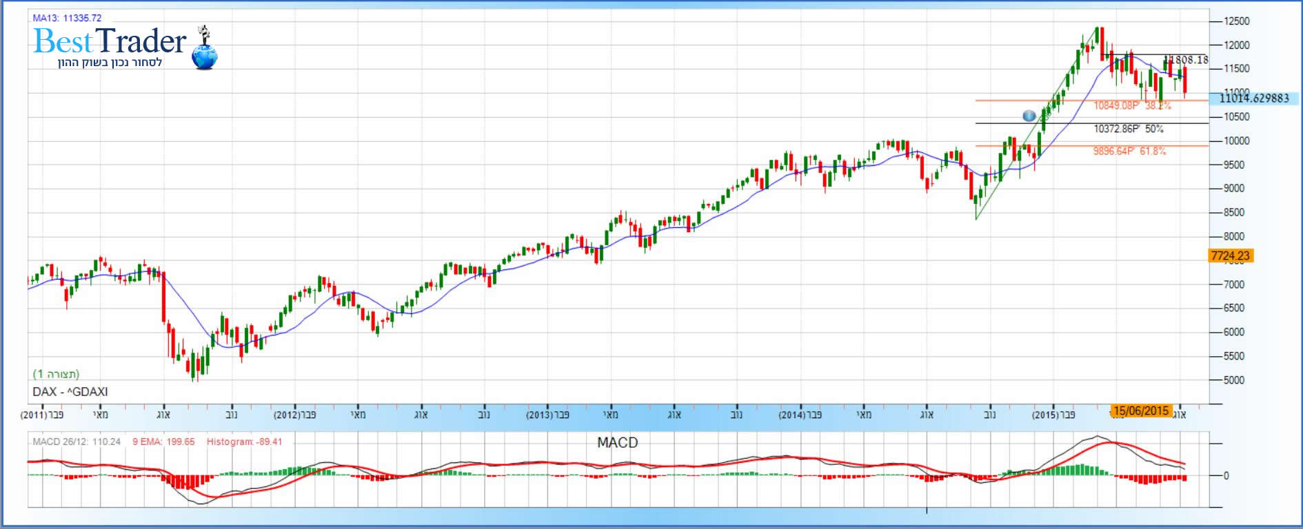 מדד ה- DAX : המדד המעניין כשמדברים על השקעות בחו"ל בימים אלו הוא מדד הדאקס (גרמניה) שתיקן באופן מדויק להפליא תיקון פיבונאצ'י 38.2% . לאחר הנגיעה בקו התמיכה המדויק של חיתוכי פיבונאצ'י הגיע גל של קונים שהקפיץ את המדד מעלה. קשה לקבוע אם התיקון הטכני בדאקס כבר מאחורינו אך ניתן לומר בסבירות גבוהה מאוד שמגמות עליה ארוכות טווח לא מסתיימות כך ולכן ניתן לומר שגם אם המדד עדיין לא סיים לתקן, חזרה למגמת עליה לאחר סיומו של התיקון היא התרחיש הסביר ביותר. בשבועות האחרונים, בדומה למצב במדד ב-S&P, קיבלנו הגדרה ברורה לגבולות הגזרה שלנו במדד הדאקס (11,808-10,840 נקודות). למעשה עד שלא נשבור / נפרוץ את הגבולות האלו לא ניתן יהיה לקבוע באופן חד משמעי מהו הכיוון בטווח הקצר – בינוני משום שכל עוד מגיעים כוחות קונים מסיביים בדיוק בתמיכה וכוחות מוכרים מסיביים בהתנגדות - אנו כלואים !