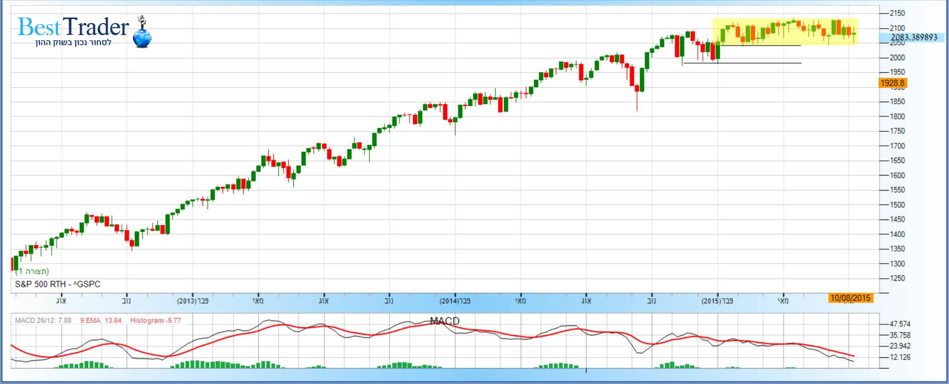 בסקירות האחרונות אנו חוזרים פעם אחר פעם על כך שמדד S&P500 מדשדש כבר כמה וכמה חודשים. למען האמת אין חדש בקשר למדד זה מהסקירות הקודמות לפחות עד שהוא יוכיח שהמלבן שבו הוא נמצא יפרץ. רק נזכיר כי המדד, למרות החולשה, עדיין נמצא במגמת עליה מובהקת (לפחות עד שיוכח אחרת). קשה להתעלם מהעובדה שהתנודתיות עולה בתוך גבולות ה"מלבן". זה אמנם חסר כל משמעות משום שהקונים באים בדיוק בזמן שהם אמורים להגיע אבל יותר ויותר פרמטרים טכניים מלמדים על חולשה ועל סטיות שליליות (סטיה ברורה מאוד ניתן לראות במתנד MACD בגרף המצורף).