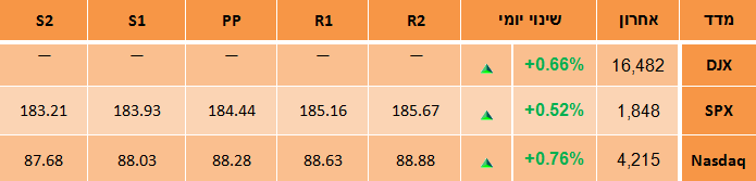 אפל (AAPL) טיפסה ב-2% לרמה של 557.36$. זה היה היום ה-3 של עליות רצופות בענקית הטכנולוגיה שרושמת זינוק של 4.6% בתקופה זו. טסלה מוטורס (TSLA) עלתה ב-1.8% לרמה של 164.13$. העליה במניה מגיעה יום לאחר שיצרנית הרכב החשמלי אמרה כי מסירות מודל S סדאן ברבעון הרביעי עלו בצורה משמעותית על הצפיות. העליות אתמול ממשיכות את המומנטום משלשום אז זינקה המניה ב-15%.