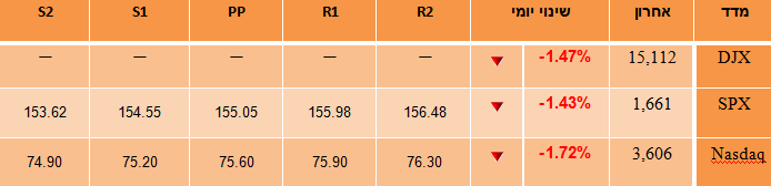 וול-סטריט רשמה את יום הירידות החזק ביותר מאז סוף יוני בחמישי, במחזורי מסחר גבוהים מהרגיל, בתגובה לדוחות כלכליים מאכזבים ותחזיות חלשות מחברות הדאו-ג'ונס וול-מארט (WMT) וסיסקו (CSCO). מדד ה-S&P 500 סיים בירידה של 1.43%, הירידה החדה ביותר מאז ירד 2.5% ב-20 ליוני. עד כה השבוע המדד רושם ירידה של 1.8%. טווח המסחר הצר בו נסחר השוק בשבועות האחרונים בין 167.52 נק' ל-170.97 נק' על תעודת הסל SPY, נשבר באופן מהותי כלפי מטה. המדד חוזר לממוצע נע ל-50 יום ולבדיקת רמת הפריצה של תבנית הקאפ האחרונה שנוצרה במהלך חודש יולי והובילה לשיאים האחרונים.