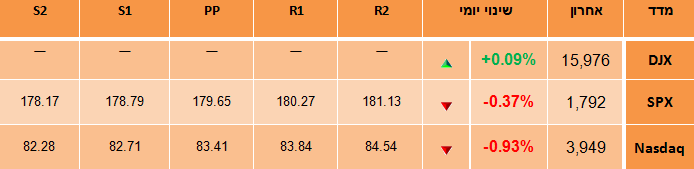 הפסיכולוגיה מתחילה להשפיע על תנועת המדדים. הדאו-ג'ונס הצליח להציץ אתמול בפעם הראשונה בהיסטוריה מבעד לרמה הפסיכולוגית 16,000 כאשר במקביל ה-S&P 500 דילג לרגע קט מעבר לרמת ההתנגדות העגולה 1,800 נק', אך תנועה זו שרדה זמן קצר בלבד, לפני שהמניות נשלחו בחבטה למטה. המשקיעים קיבלו רגליים קרות ומיהרו ללחוץ על כפתור ההשהייה לאחר העליות החדות האחרונות. מדד ה-S&P 500 סיים בירידות של 0.4%. מדד הנאסדק היה החלש מבין 3 המדדים וסיים בירידה של 0.9%.