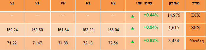 הסחורות החלו להפגין עוצמה משמעותית בלילה עוד טרם פתיחת המסחר. העליות האלו סיפקו תנופה משמעותית לסקטורים מוטי הצמיחה. החוזים העתידיים על הנחושת קפצו ב-3.3% לרמה של 3.157$ לפאונד בעוד החוזים על הזהב עלו ב-2.4 לרמה של 1,252.50$ לאונקיה. באופן דומה, תעודת הסל על מכרות הזהב GDX הוסיפה 1.6% ותמכה בסקטור הסחורות שסיין בין המובילים.