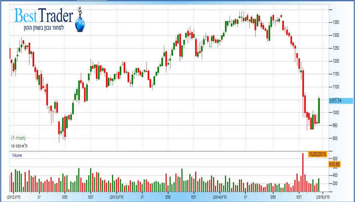מדד מניות ת"א גז נפט – גרף שבועי, 1,055.54 נקודות. קרדיט: FXGraph