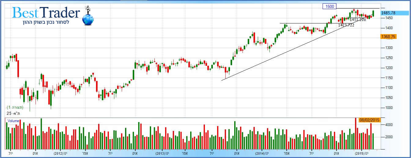 בסקירות הקודמות ציינו את נקודת התמיכה סביב 1450 נקודות וכן סביב 1420 נקודות. חידדנו כי הסיכוי לעליה גדול מהסיכוי לירידה כל עוד שומרים על רמות תמיכה אלו. השבוע טיפס המדד ונעל את שבוע המסחר על 1485.78 נקודות תוך שהוא שואב עוצמה רבה הן ממניות הבנקים והן ממניות הגז-נפט ונראה כאילו גדל הסיכוי לראות פריצה לשיא חדש בקרוב, אם כי אנחנו עדיין לא שם. מחזורי המסחר עדיין לא שכנעו שאנחנו ממש שם. כדי להפוך את הפריצה לאמינה יותר ואמין מחזורי המסחר חייבים לגדול.