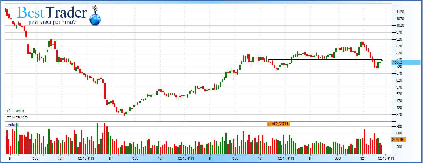 בסקירות הקודמות נגענו באחד הסיפורים החמים של השבועות האחרונים והוא הטלטלה שחזרה להכות במדד מניות ת"א תקשורת. הדגשנו כי נשברה תמיכה משמעותית במחזור מסחר גבוה במדד מניות התקשורת ובשבוע האחרון חווינו ניסיון התאוששות כושל לשוב ולעלות אל מעבר לקו התמיכה (שהפכה להתנגדות) שנמצא באזור 770 נקודות. התקופה הקרובה תהיה קריטית, אם יצליח המדד לטפס מעל רמה זו במחזור גבוהה ולשהות שם הרי שהדרך למעלה פתוחה לפניו אך אם ימשיך להכשל שוב בקרוב סביר להניח שתחתית חדשה במדד מניות התקשורת היא רק עיניין של זמן. השבועות האחרונים מוכיחים לנו בינתיים שברמת 770 נקודות ממתין היצע רב המקשה על המדד להתאושש.