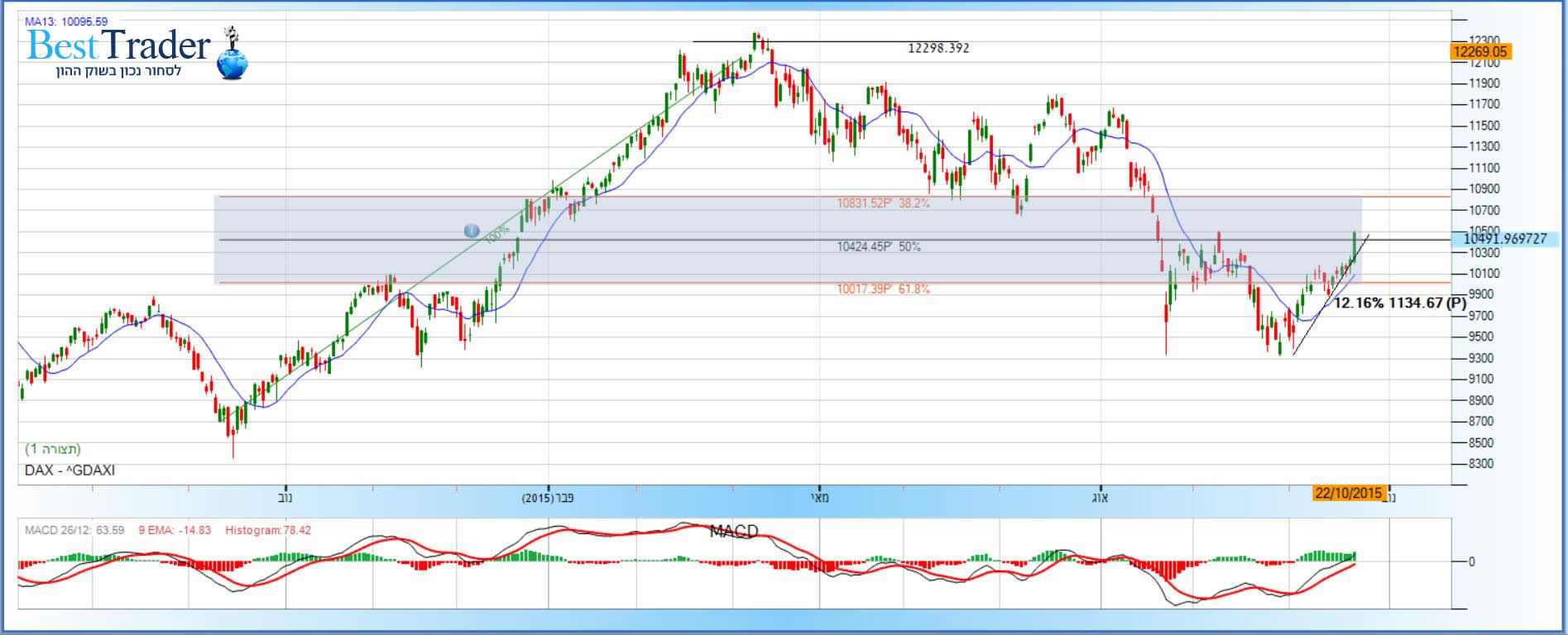 מדד ה- DAX : כשמנתחים את כל המדדים ומדברים על התאוששות בכולם זה כמובן נכון גם לגבי מדד הדאקס אך אם בסקירה הקודמת הדאקס היה ה"סוס עם הפתיחה החלשה יותר" כרגע התהפכו הדברים והדאקס צבר מומנטום ונראה מצויין להמשך. הדאקס כבר זינק בכ-12% מהתחתית שנרשמה בסוף חודש ספטמבר. אמונם של הקונים שב בהדרגה לאחר שבירת כל התנגדות. אם ידע הדאקס להתמודד בהצלחה עם ההתנגדות המשמעותית באזור 10,850-10,900 נק' אנו צפויים לראות ניסיון לבחינת שבירת שיא חדש בדאקס.