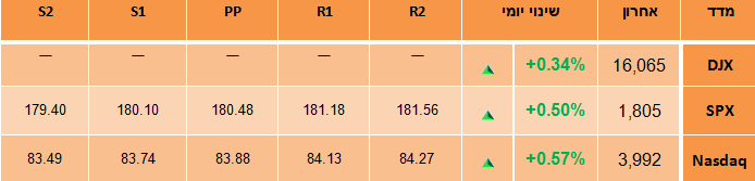 בסיכום שבועי: מדד הדאו-ג'ונס ומדד ה- S&P 500 רושמים שבוע שביעי רצוף של עליות. מדד הדאו-ג'ונס עלה ב-0.6%, מדד ה-S&P 500 עלה 0.4%. הנאסדק עלה ב-0.1%.