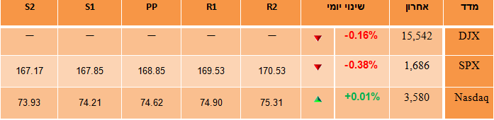 המניות לקחו צעד אחד אחורה ביום רביעי וירדו בכשליש האחוז, בעוד מניות סקטור השירותים והסחורות מקזזות את העליות בסקטור הטכנולוגיה שנהנה מדוחות טובים של אפל (AAPL). מדד ה-S&P 500 רשם בפעם הראשונה החודש רצף ירידות של יומיים וזאת לאחר שהצליח להשיג בפתיחה שיא גבוה של כל הזמנים ברמת 1,698.78 נק'. זה רק עניין של זמן לפני שהשוק יצליח לפרוץ את רמת 1,700 נק' שמשמשת כרמה פסיכולוגית. פריצה של רמה זו עשויה להוביל לפעילות ערה לאחר-מכן. ישנם עו 100 מיליארד דולר של כסף שחונה על הקווים נכון לעכשיו. מחזורי המסחר אנמיים מאחר והרבה אנשים עדיין נמצאים בעמדת המתנה, כך שהשוק עשוי להיסחף הצידה לשארית הקיץ.