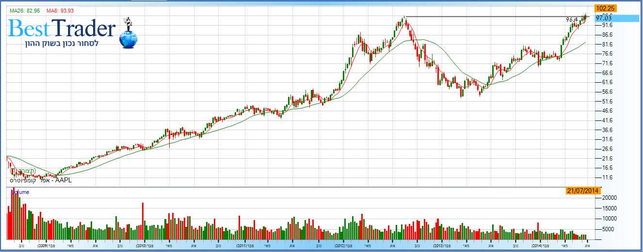 מניית אפל AAPL גרף שבועי. 97.03 נקודות. קרדיט: FXG פרימיום
