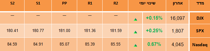 שישי: לאחר 'חג ההודיה' שנחגג בארה"ב ביום חמישי ובו וול-סטריט נותרה סגורה, הבורסה תיפתח למסחר ביום שישי למחצית היום בלבד. זהו ה'בלאק פרידיי' בארה"ב והקונים מסתערים על הדילים הטובים ביותר שמציעות ביום זה רשתות השיווק. מניות הקמעונאות צפויות להיות במרכז העניין של הסוחרים היום. יום שישי הוא יום המסחר האחרון לחודש נובמבר. המדדים רושמים עליות משמעותיות בחודש זה. הדאו ג'ונס עם עליה של 3.6%, ה-S&P 500 עם עליה של 2.9% והנאסדק עם עליה של 3.2%. מעל כולם צוחק לו מדד הראסל 2000 עם עליה חדה של 3.7%.
