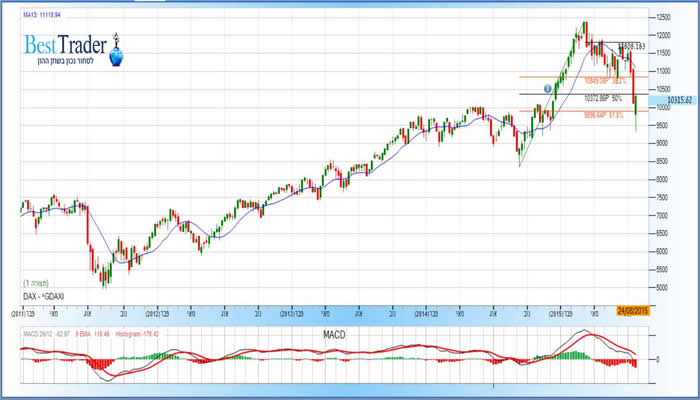 בדומה לכל השווקים בעולם גם המדדים בארה"ב ובגרמניה הושפעו ישירות מהקריסה בסין. רבות דיברנו כאן בסקירות הקודמות על חולשת מדד S&P500 תוך שאנו מציינים פעם אחר שיותר ויותר פרמטרים טכניים מלמדים על חולשה ועל סטיות שליליות. אז לכל דשדוש יש סוף וכשמחברים: דישדוש ארוך + סטיות שליליות + טריגר אמיתי לירידות חדות מקבלים תוצאות של מיני-מפולת. זה בא לידי ביטוי של צלילה חדה מאוד של כ- 230 נקודות בימים ספורים (מ-2100 נק' עד 1870 נק'). שוב, בדומה למצב במדד המעוף, מאוד מוקדם בשלב הזה להעריך האם אנחנו בסך הכל בשלב הריבאונד לירידות או שסיימנו את התיקון ופנינו מעתה ואילך כלפי מעלה. די ברור שהביטחון של המשקיעים נסדק מאוד והמדד הפחד (ה-VIX) שזינק השבוע בצורה קיצונית יכול ללמד על כך. יחד עם זאת הנר היפני האחרון (שעדיין לא נקבע סופית עד היום בערב – סוף השבוע) מראה בנתיים על היפוך ברור ואם היום יחתם המסחר ברגיעה או בעליות סביר להניח שגם הימים שיבואו אחריו ימשיכו את האווירה החיובית.