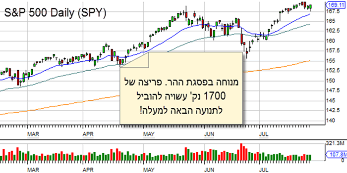 מדד ה-S&P 500 חונה בפסגת שיא כל הזמנים ומתחת לרמה הפסיכולוגית 1,700 נק'. פריצה של רמה זו, צפויה להזרים כסף נוסף לשוק ותייצר את התנועה הבאה למעלה. מלמטה תיקון בהחלט עשוי להתפתח מהרמות הנוכחיות עם נסיגה ראשונית שביכולתה להוביל את השוק למנוחה על ממוצע נע ל-20 יום שנסחר ברמה של 166.81 נק' ולאחר מכן לממוצע נע ל-50 יום ברמת 164.35 נק'.