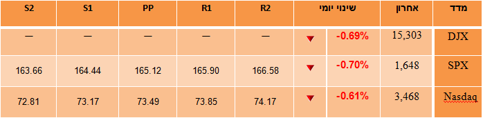 המניות נפלו ביום רביעי. המדדים ניסו לטפס מרמתם הנמוכה ביותר בשפל היומי, אך עדיין סיימו באדום עם מדד ה-S&P 500 שמסיים בירידות של 0.7%. קבוצת המניות שמניבות דיבידנד גבוה איבדו חלק מהזוהר שלהן לאחר עליות בתשואות האג"ח הממשלתיות. תשואת האג"ח הממשלתית הגיעה לרמה של 2.235% - הרמה הגבוהה ביותר מזה שנה – כאשר היא עולה בהתמדה מאז שבוע שעבר בו יו"ר הפד בן ברננקי העלה את מפלס החששות כי הפד עשוי לרסן את קצב תוכנית רכישות האג"ח מוקדם מכפי שהמשקיעים ציפו.
