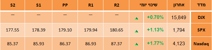פייסבוק (FB) זינקה ב-14.1% וסיימה ברמת 61.08$, כאשר היא משיגה את שיא כל הזמנים בפסגה היומית ברמת 62.50$. הזינוק במניה הזריק אופטימיות רבה למדד ה-S&P 500 ולמדד הנאסדק. הרשת החברתית הגדולה בעולם העבירה את צמיחת ההכנסות הטובה ביותר שלה מזה שנתיים ביום רביעי, והיכתה את תחזית האנליסטים.