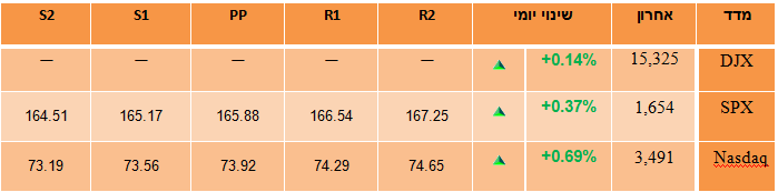 נראה כי המשקיעים אהבו את צבר החדשות ושלחו את המניות למעלה, כאשר מדד הדאו-ג'ונס מצליח להתאושש מיום הירידות הגרוע ביותר בכמעט 4 שבועות ומסיים בעליה קלה של 0.14%. מדד ה-S&P 500 הציג עליות של 0.37% בסיום. 6 מתוך 10 הסקטורים סיימו בירוק, כאשר סקטור הטכנולוגיה וסקטור הפיננסים מובילים את העליות.