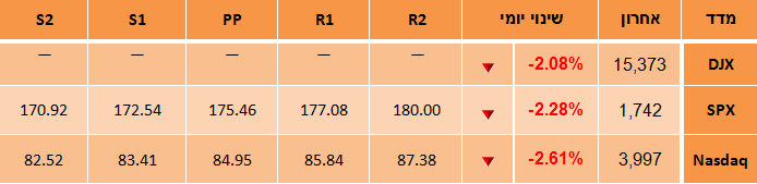 בוידאו השבועי של מכללת מגמות שניתן לצפייה כאן, ניתח שלמה קופר את המדדים ובחר כנקודת מפתח לשבוע הנוכחי את רמת 177 נק' בתעודת הסל SPY. רמה זו נבדקה מספר פעמים במהלך שבוע שעבר וחופפת תמיכת מחירים מיום הפד ב-18 לדצמבר. שבירה של רמה שלחה אוטומטית את השוק לעבר התמיכה הבאה באזור 174.3 נק', כאשר המשך המכירות עלולים לשלוח את השוק לנפילה נוספת עד למפגש עם ממוצע נע 200 לטווח הארוך שעובר נכון להיום ברמת 170.91 נק'.