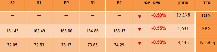 נראה כי המשקיעים עייפים מלהחזיק עמדות לונג במניות. השוק לא הצליח להמשיך בהתלהבות בימים האחרונים וזה כמובן מזמין את המשקיעים לממש רווחים. נראה כי מדד ה-S&P 500 נסוג לעבר ממוצע נע ל-50 יום שעומד ברמת 1,602 נק'. ובנתיים מדד הדאו-ג'ונס קטע את הרצף הארוך של 20 שבועות בהם בכל יום שלישי הצליח להשיג עליות. זהו רצף הימים החיובי הארוך ביותר שאי פעם נרשם בהיסטוריה.