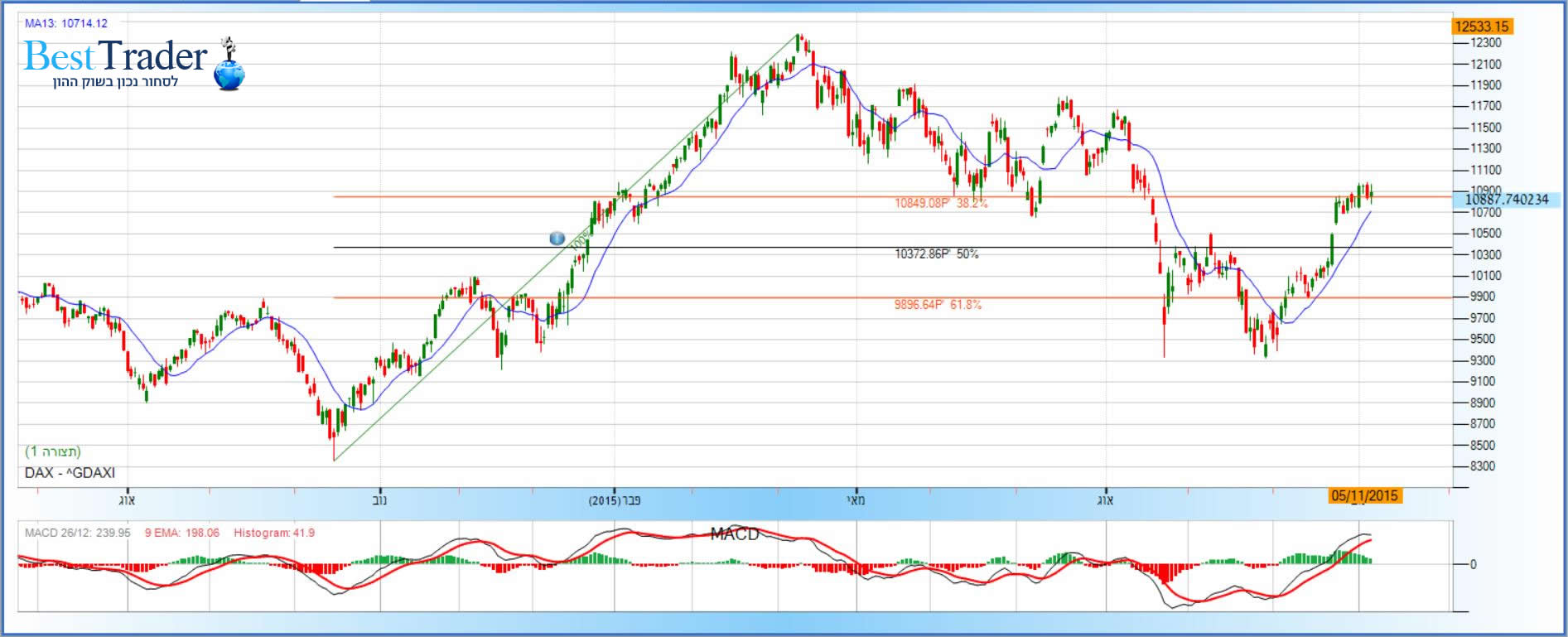 מדד ה- DAX : כשמנתחים את כל המדדים ומדברים על התאוששות בכולם זה כמובן נכון גם לגבי מדד הדאקס אך אם בסקירה הקודמת הדאקס היה ה"סוס עם הפתיחה החלשה יותר" כרגע התהפכו הדברים והדאקס צבר מומנטום ונראה מצויין להמשך. הדאקס כבר זינק בכ-17% מהתחתית שנרשמה בסוף חודש ספטמבר. אמונם של הקונים שב בהדרגה לאחר שבירת כל התנגדות. כפי שציינו כאן בסקירה הקודמת, אם ידע הדאקס להתמודד בהצלחה עם ההתנגדות המשמעותית באזור 10,850-10,900 נק' איתה הוא מתמודד בימים אלו, אנו צפויים לראות ניסיון לבחינת שבירת שיא חדש בדאקס.