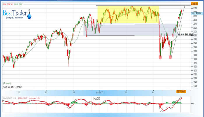גם מדד ה-SP500 מתרחק מהשפל ומראה על עוצמה גבוהה והוא כבר נמצא סמוך לשיא כל הזמנים. לאחר שנבלם בתחתית כפולה וביצע זינק מטאורי של כ-13% מהשפל סביר להניח שינסה המדד לאתגר את רמות השיא ב-2130 נקודות. היום לפני פתיחת המסחר (15:30) יפורסמו נתוני התעסוקה. הצפי / קונצנזוס של השוק הוא ל-180,000 (שינוי במספר המועסקים במגזר הלא חקלאי) וליציבות בשיעור אבטלה (5.1%). שיפור דרמטי מידי עשוי ליצור אפקט הפוך ולגרום דווקא לירידות בשווקים בגלל חשש המשקיעים מהעלאת ריבית. דווקא נתונים חלשים עשויים להקפיץ את השוק בדיוק מאותה סיבה.