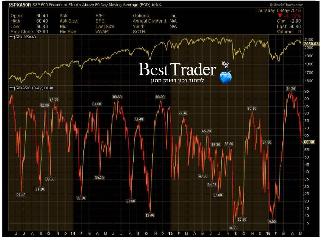 אם יש בסקירה הזאת אלמנט מפתיע הוא מגיע דווקא מכיוון מדד ה-S&P500. המדד דווקא נראה חיובי ביותר ונראה היה כי שיא כל הזמנים הוא רק עניין של זמן אך לעת עתה הוא נכשל במשימה זו. מדד הפחד לא עלה (עדיין) באופן משמעותי והוא עומד כעת רק על 15.91 נקודות אבל העניין המשמעותי נמצא כרגיל במה שמתחבא מאחורי הקלעים. בעוד אחוז המניות הנמצאות המגמה שורית גבוה מאוד (מעל 70% - כפי שניתן לראות בגרף), ניתן לראות נתון שמראה שאחוז המניות במדד שנסחר מעל ממוצע נע 50 ימים צנח בזמן קצר מאוד מ-94% ל-60% בלבד !!!